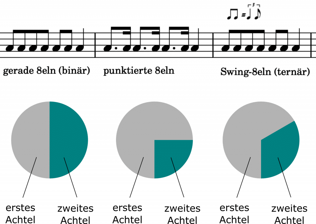 Dies ist auch die Notation, die in Noten verwendet wird, um der Pianistin die Anweisung zu geben, sie soll die Achtelnoten «ternär» spielen. Manchmal steht jedoch einfach «Swing» oder «Triplet Feel» (Triolen-Gefühl). Alle diese Stichwörter meinen, dass die Achteln in der Länge nicht mehr 50:50 sein sollen, sondern 66:33. Selten werden Swing-Achteln auch als punktierte Achtel + Sechzehntel notiert, weil das der Rhythmus ist, der dem Swing relativ nahe kommt. Korrekt ist diese Schreibweise jedoch nicht, denn bei einem punktierten Achtel + Sechzehntel ist das Verhältnis der beiden Töne 75:25, also 3:1.