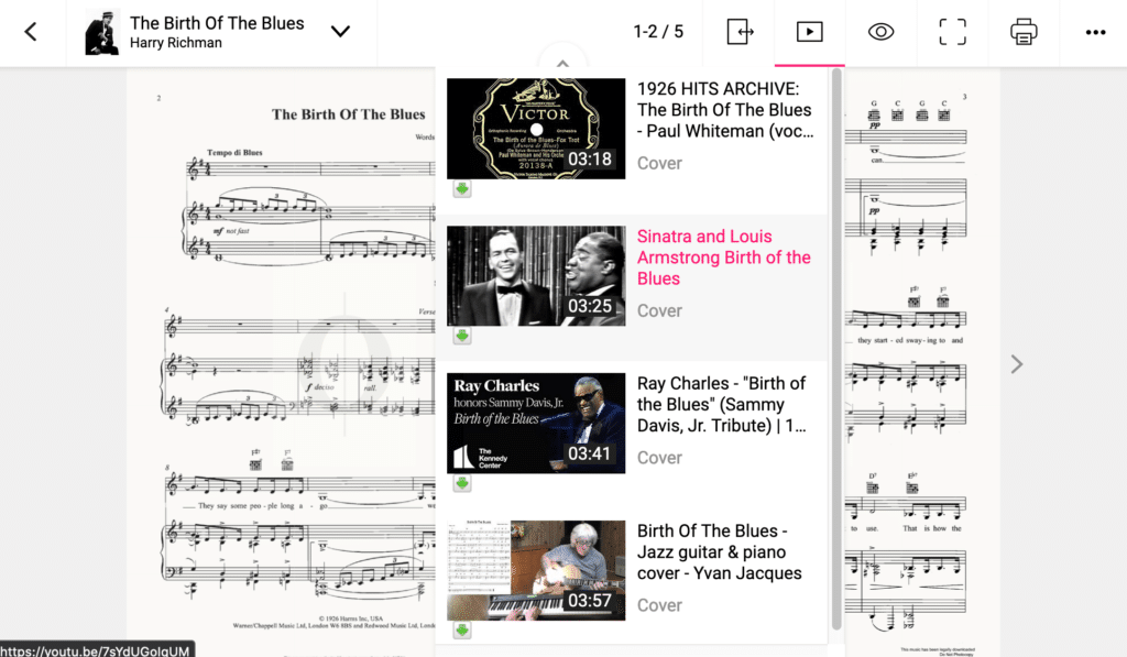 Komfort ist ebenfalls ein Vorteil: Du hast eine Suchfunktion, Kategorien, automatische Vorschläge, Du kannst Noten wahlweise nach unten oder nach rechts scrollen, zu den Noten gibt’s automatisch Links zu YouTube-Videos vom Lied etc.